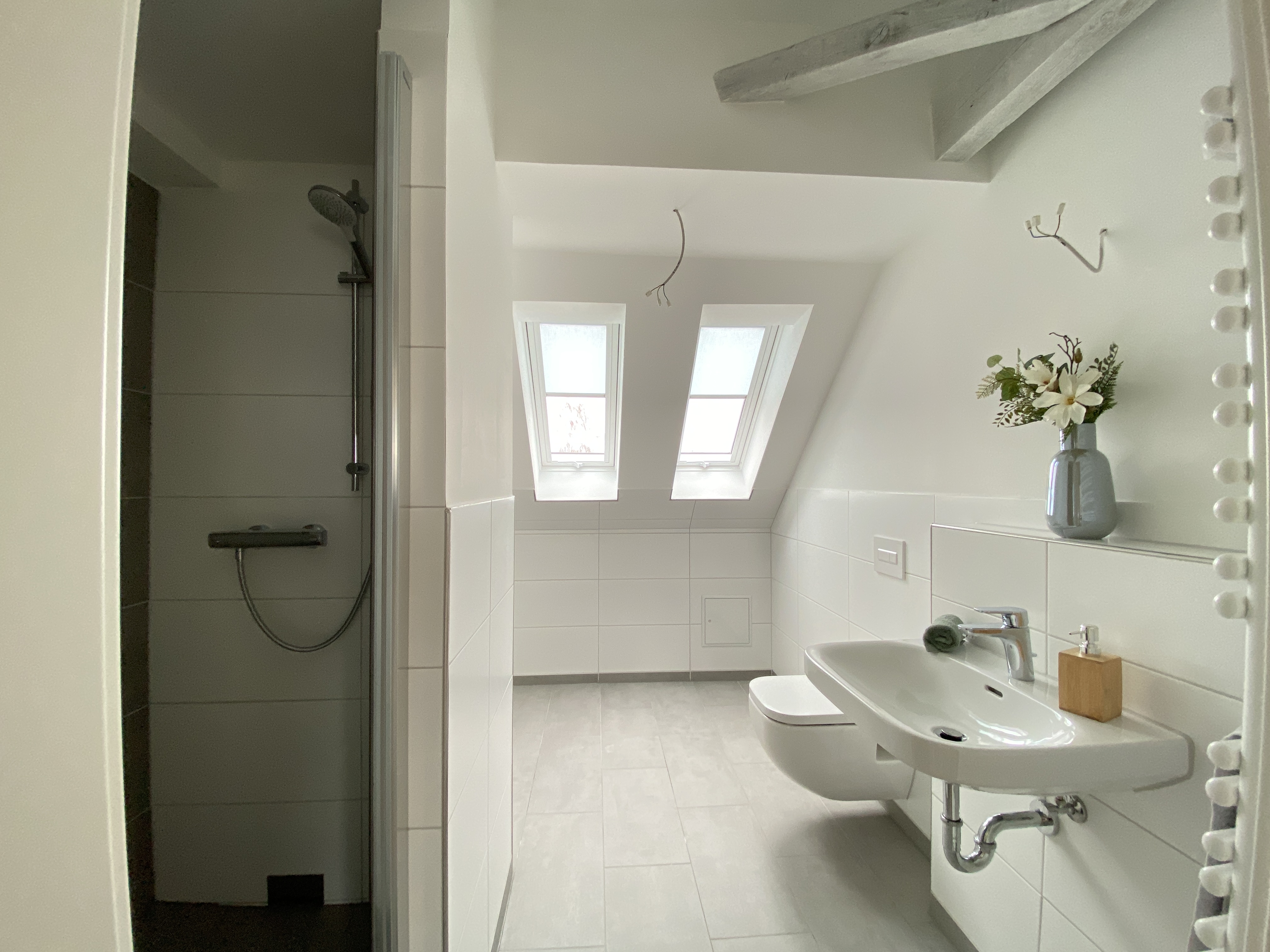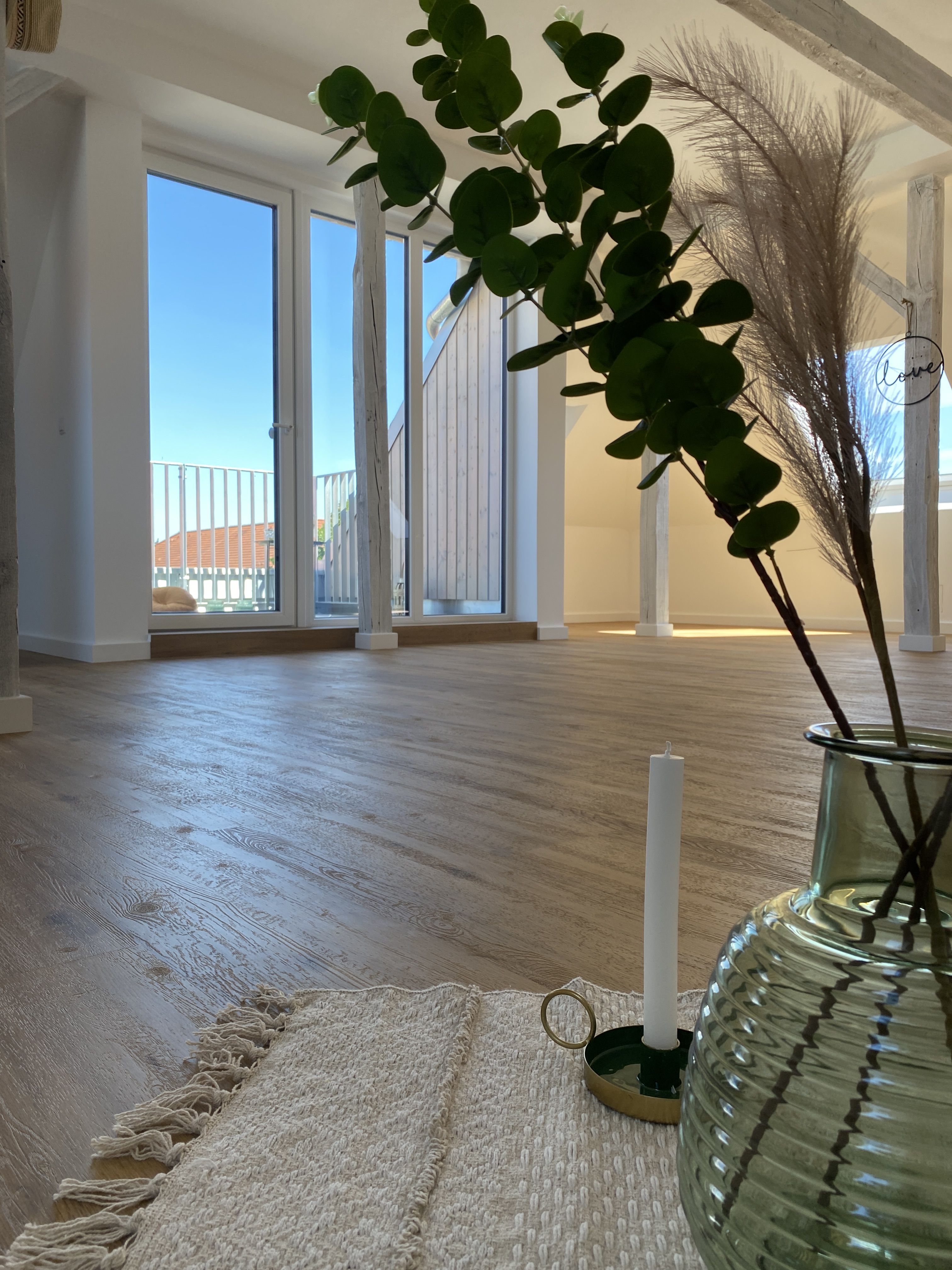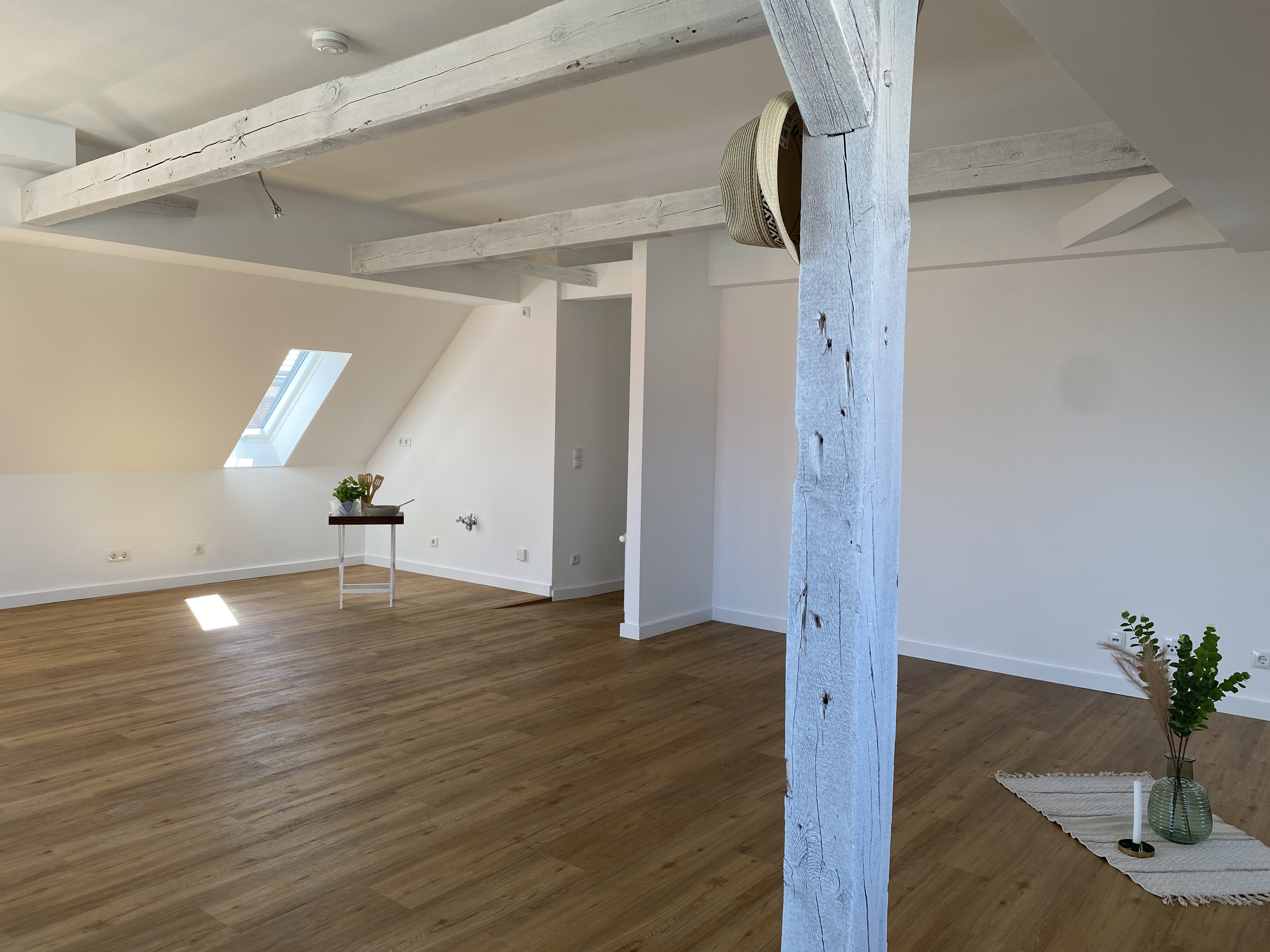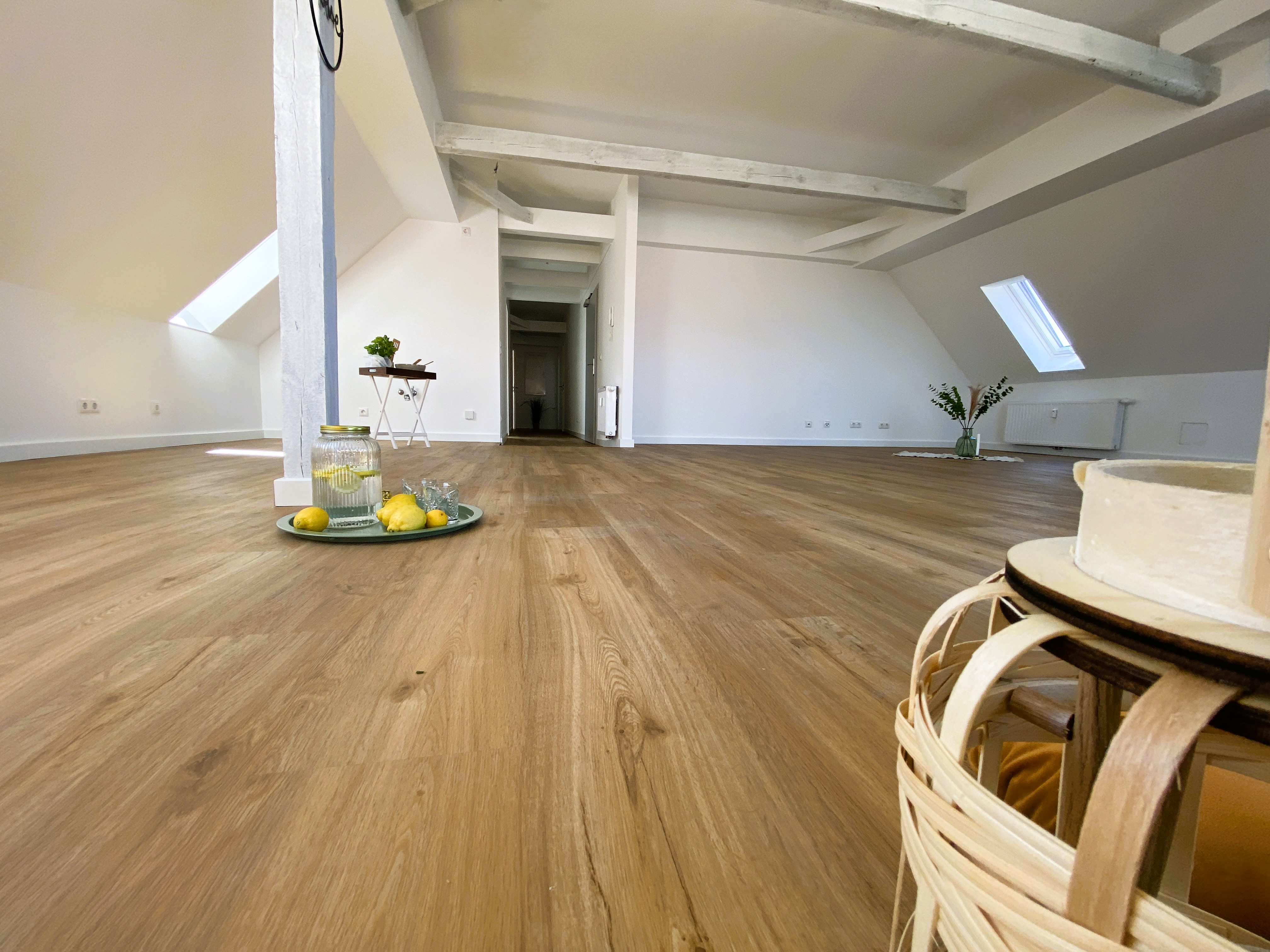 In allen anderen Räumen wurde Designbodenbelag passend zum vorhandenen Gebälk in gekälkter Holzoptik verlegt, sodass auch hier das ein oder andere exklusive Möbelstück bestens platziert werden kann.