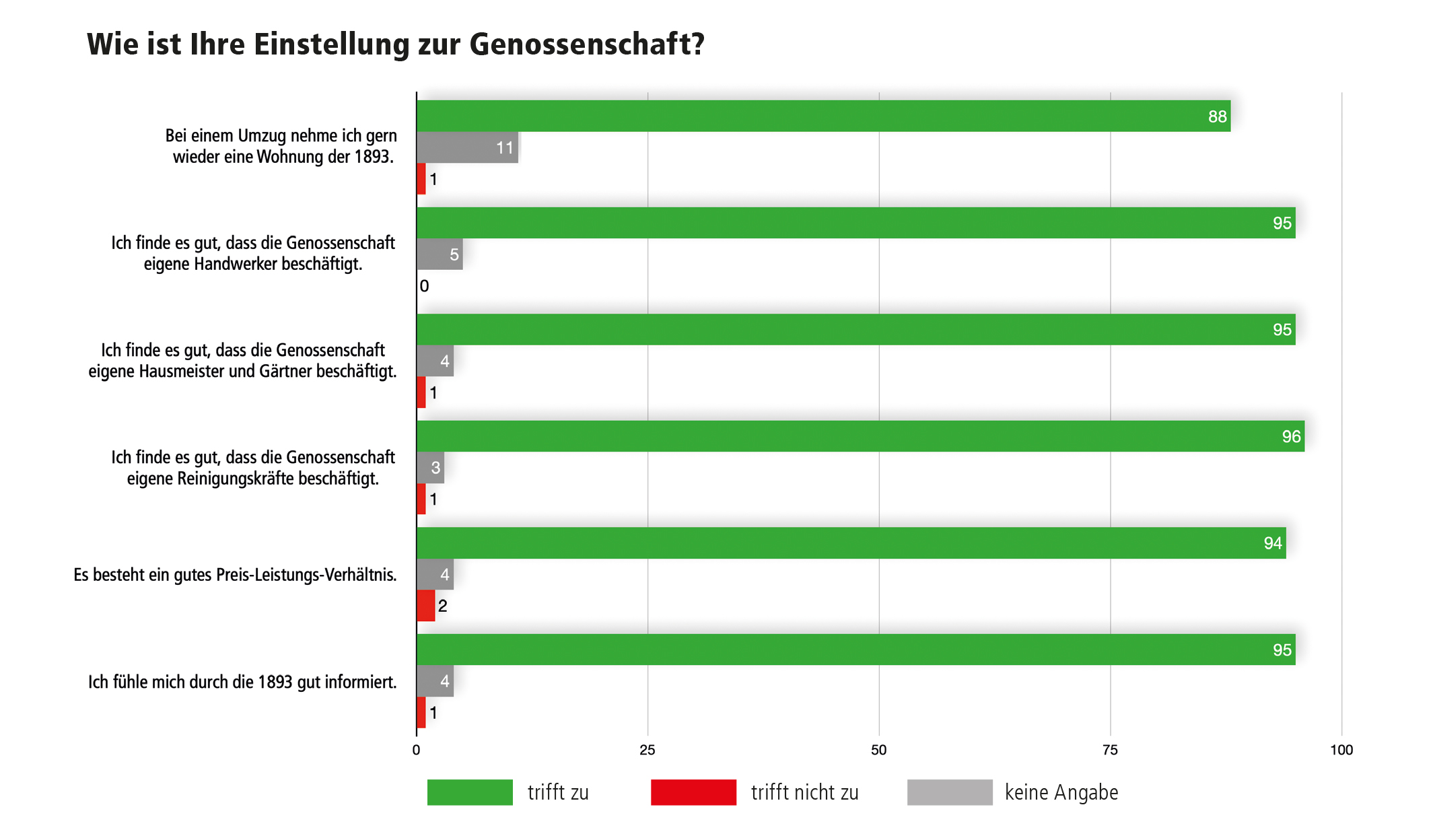 Die Auswertung der Frage zur Einstellung unserer Mitglieder zur Genossenschaft zeigt ein durchweg positives Bild: Für nahezu alle abgefragten Aussagen geben zwischen 88 % und 98 % der Teilnehmenden an, dass diese auf die 1893 zutreffen. Besonders hervorzuheben ist, dass sich 98 % der Mitglieder bei uns gut aufgehoben fühlen und 90 % der Befragten dem Unternehmen einen guten Ruf bescheinigen. Auch mit Blick auf die Beschäftigung eigener Reinigungskräfte, Handwerker sowie Hausmeister und Gärtner zeigt sich eine sehr deutliche Zustimmung – rund 95 % der Mitglieder bewerten dies positiv. Die geringe Zahl neutraler Antworten verdeutlicht, dass sich die Mitglieder eine klare Meinung gebildet haben. Wir sind nach wie vor fest davon überzeugt, dass die Entscheidung zu eigenen Mitarbeitern in den Bereichen Regiebetrieb und Facility Management die richtige war, und freuen uns noch mehr darüber, dass diese Entscheidung nahezu vollumfänglich von Ihnen mitgetragen und vor allem aber geschätzt wird.