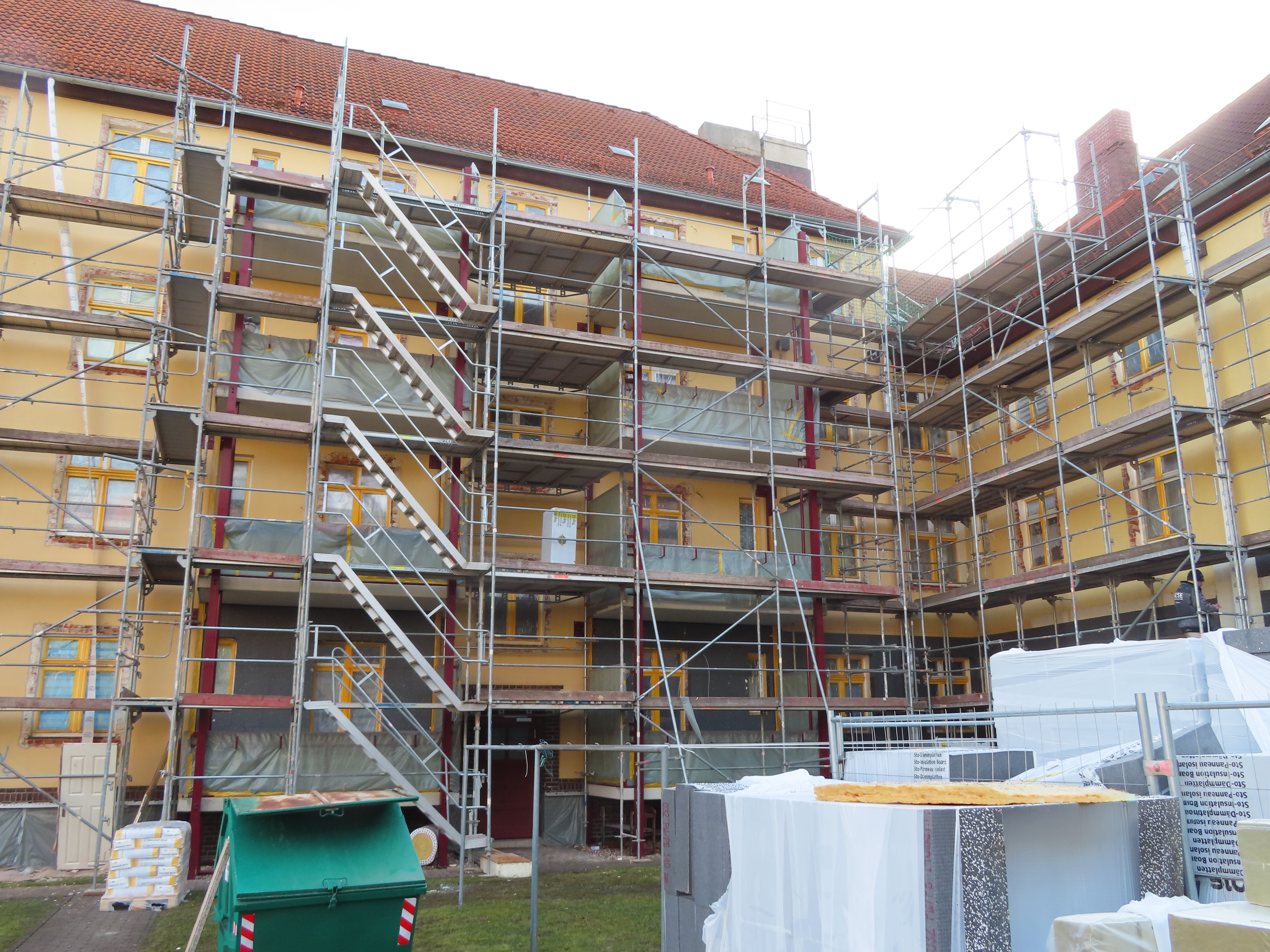Bis Mitte Dezember 2025 wurde auch die Straßenseite der Heinrichstraße 23 a, b eingerüstet und gedämmt. Aufgrund des Jahreswechsels und anschließender witterungsbedingter Pause konnten die Putzarbeiten hier nicht mehr fertiggestellt werden. Ende Februar wurden die Arbeiten wieder aufgenommen und werden nun auf der Hofseite des Objektes weitergeführt. Bei optimalen Witterungsbedingungen soll die Baumaßnahme Mitte des Jahres beendet werden.