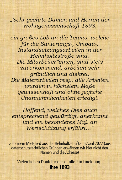 Darüber hinaus ist uns in den letzten Wochen ein lieber Mieterbrief zugestellt worden, den Sie in der Bildergalerie lesen können.
