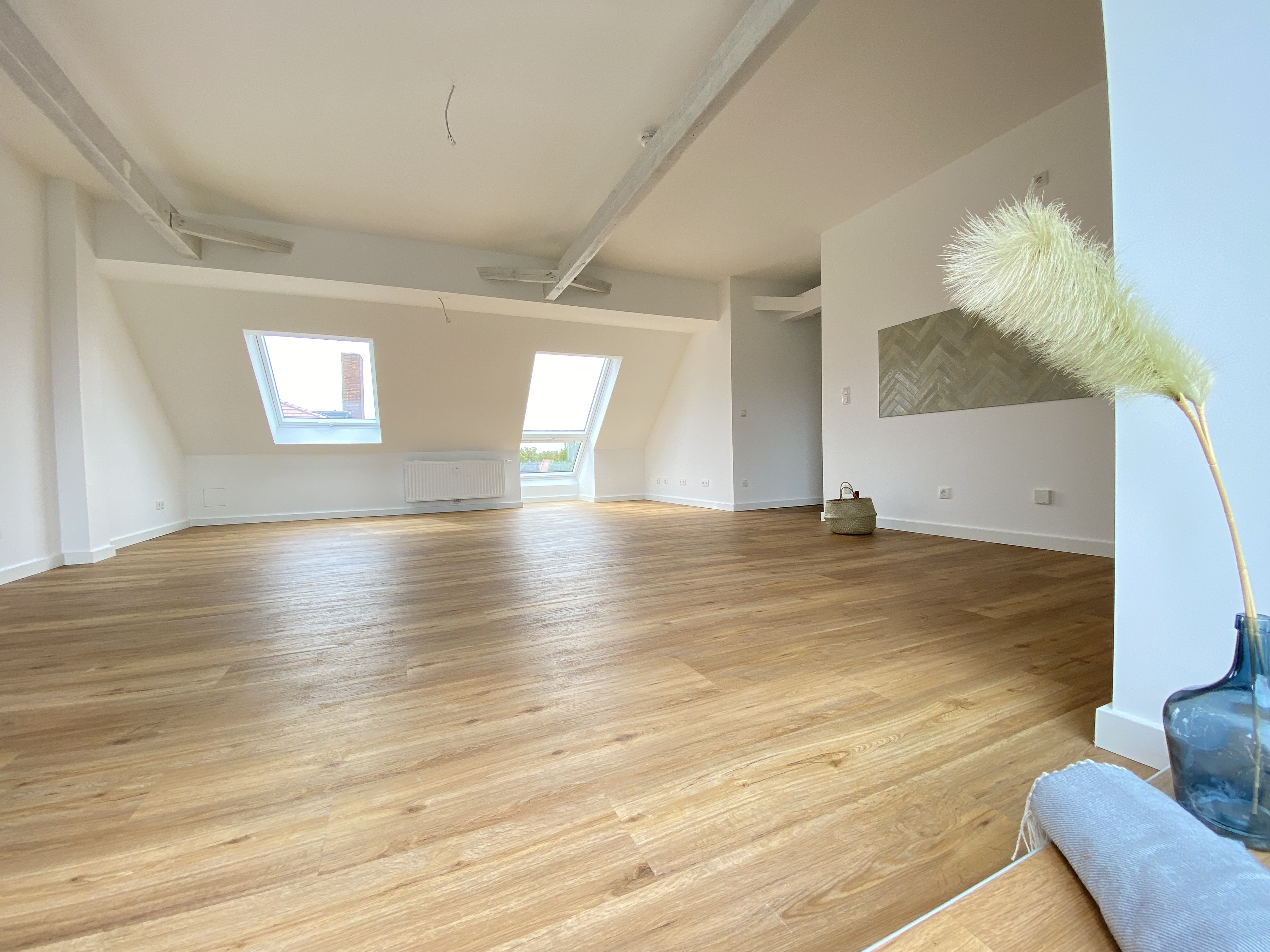 In allen anderen Räumen wurde Designbodenbelag passend zum vorhandenen Gebälk in gekälkter Holzoptik verlegt, sodass auch hier das ein oder andere exklusive Möbelstück bestens platziert werden kann.