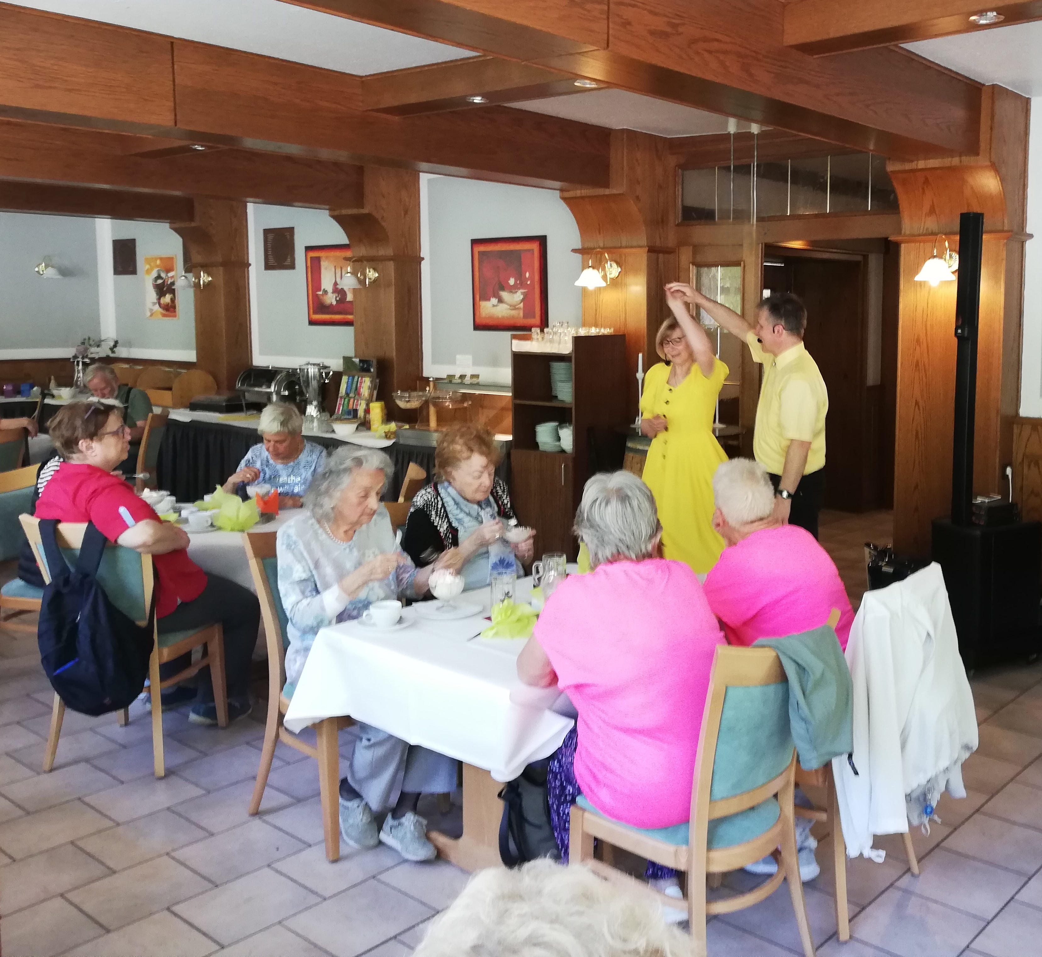 Nach ausreichend frischer Luft am Vormittag kehrten wir in das Hotel zur Forelle ein. In der hauseigenen Gaststätte begrüßte uns bereits der Harzer Jodlermeister mit seiner Frau. Mit Ihrem Singen, Jodeln und Tanzen animierten sie uns zum Mit-Schunkeln, fast wie auf unserer Weihnachtsfeier.